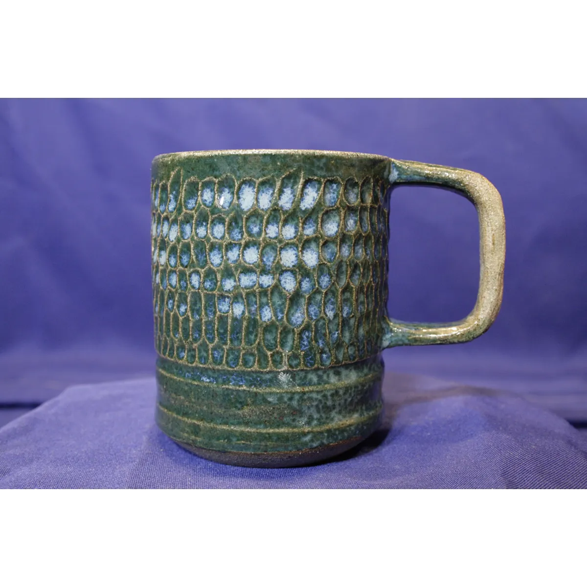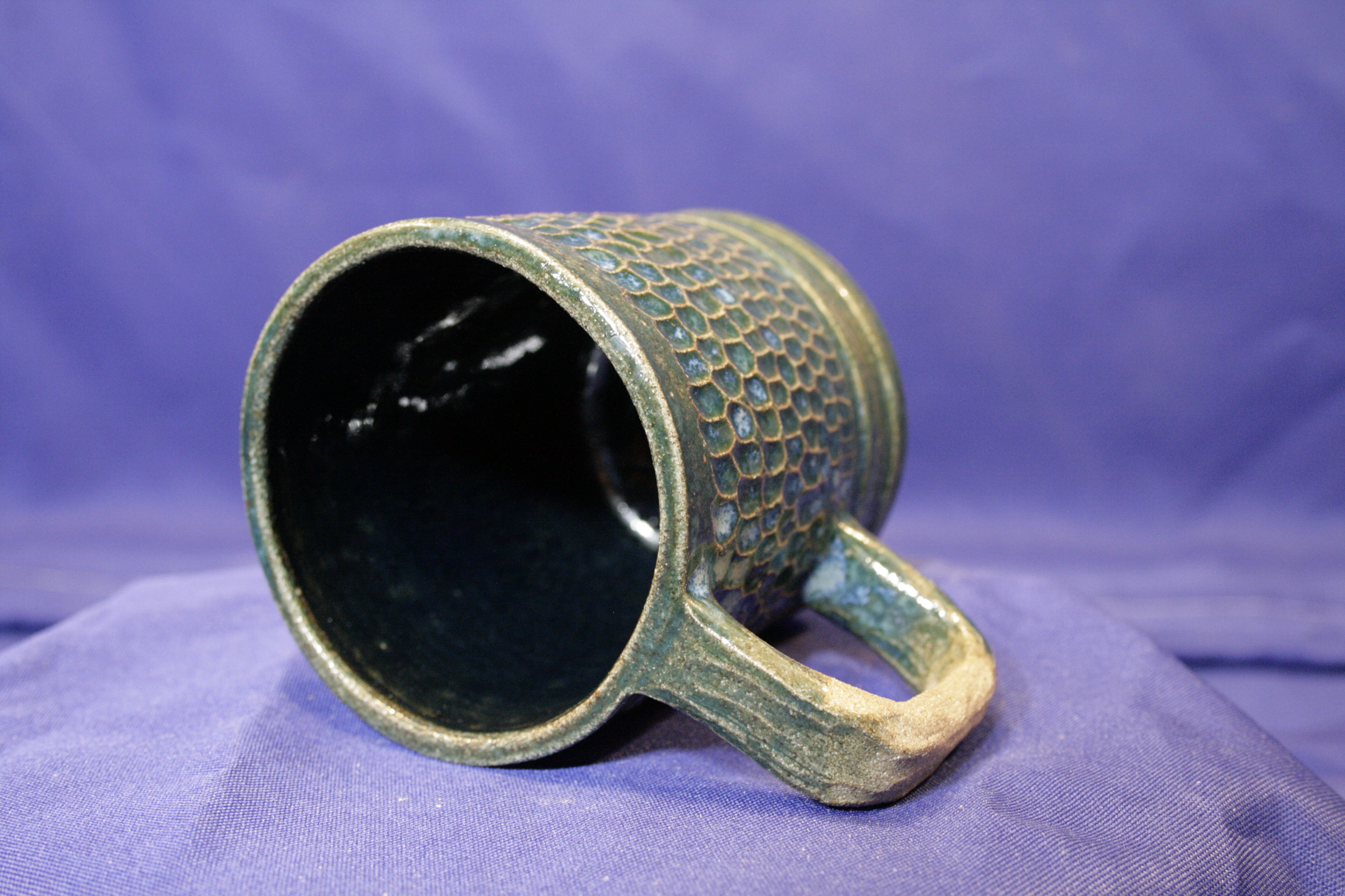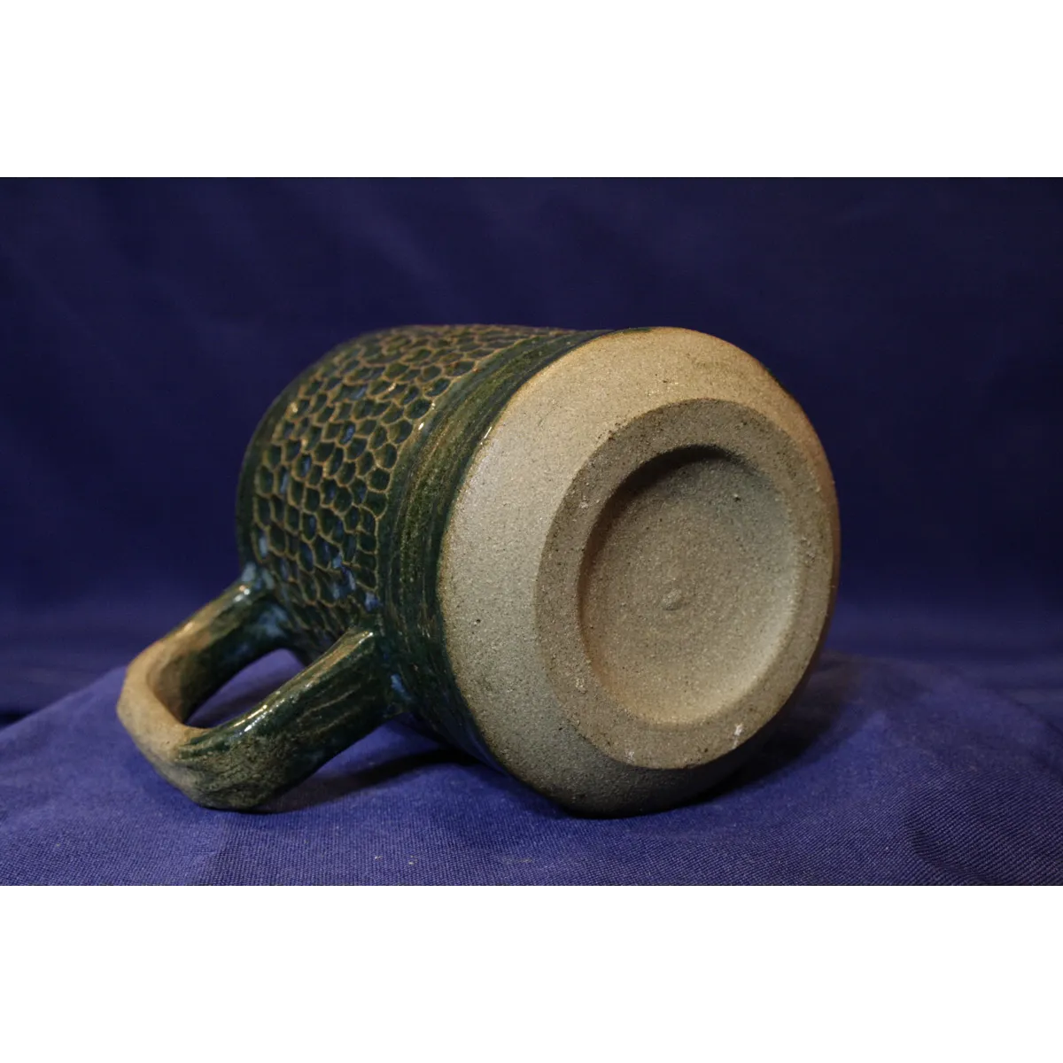 Green glaze with lighter variation throughout, hand carved texture. Featuring raw clay handle.